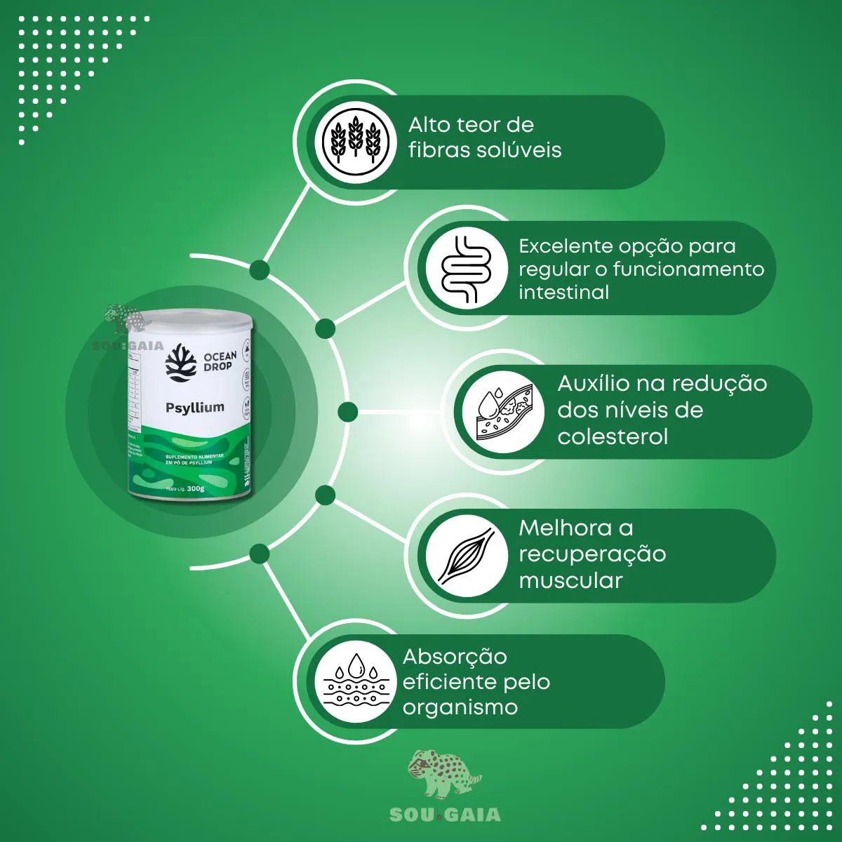 Regularidade Intestinal: O psyllium forma um gel viscoso que ajuda a aliviar a constipação e regulariza o trânsito intestinal, promovendo um sistema digestivo saudável.