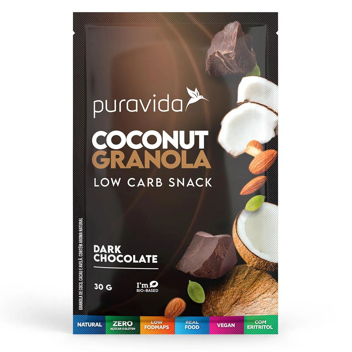 A granola Puravida Mini é um snack lowcarb de granola coconut, uma verdadeira explosão de sabor ultracrocante. Com uma fórmula livre de glúten e com zero açúcares, além de ser livre de aditivos sintéticos e adoçantes que causem efeitos colaterais, possui alto teor de nutrientes e fibras, contribuindo diretamente para a saciedade. Este snack vegano pode ser usado também para complemento de uma dieta low carb.