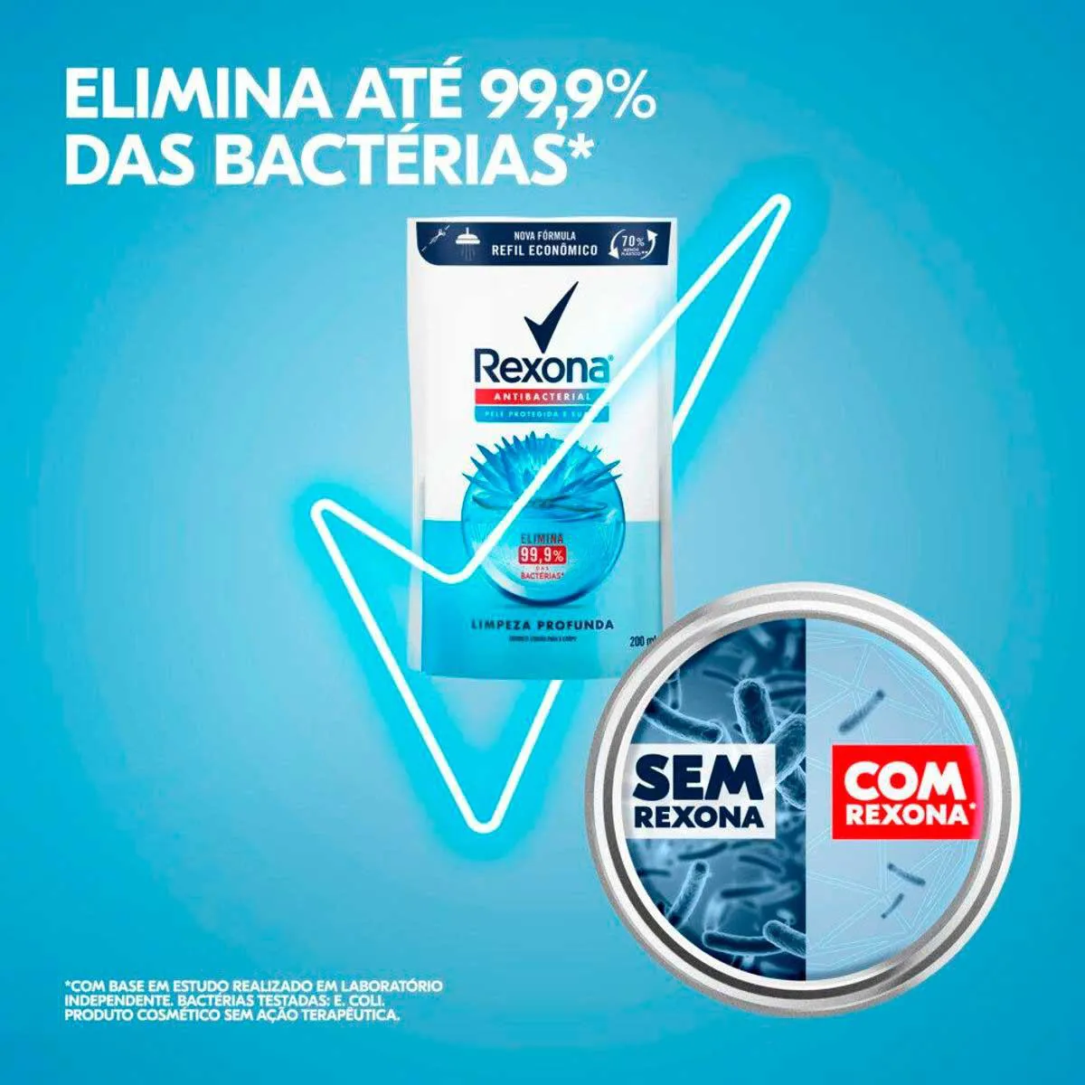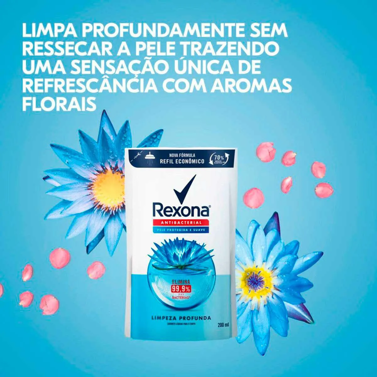 O Rexona Antibacterial Limpeza Profunda é um sabonete líquido que oferece 10 vezes mais proteção que os sabonetes comuns. Seu uso proporciona refrescância e oferece uma deliciosa sensação de banho tomado por mais tempo, mantendo a pele limpa, saudável, hidratada e perfumada.