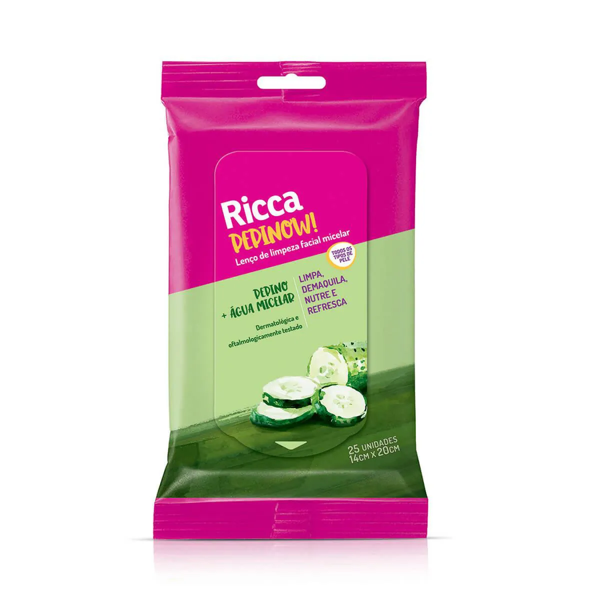 Seja qual for o seu tipo de pele, o lenço de limpeza facial Calmante Ricca Pepinow. É o parceiro ideal para quem busca remover a maquiagem ao mesmo tempo que limpa, nutre, refresca e hidrata a pele.