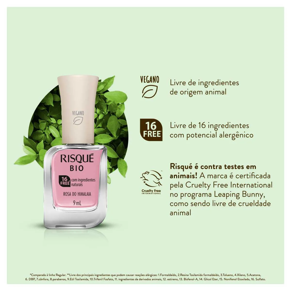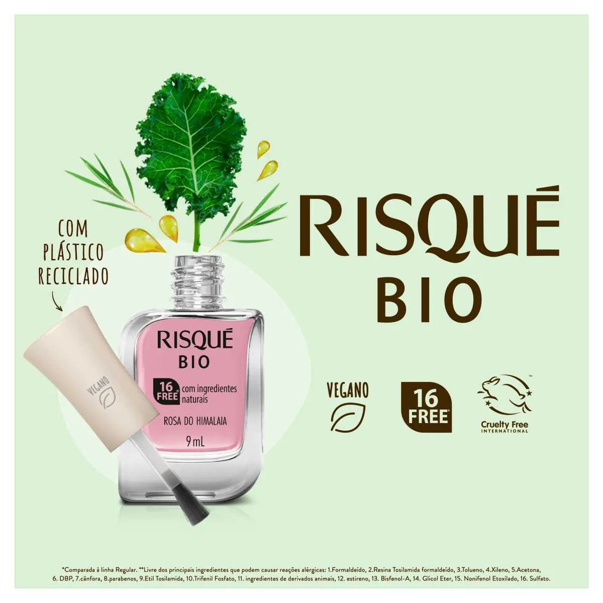 A nova linha de esmaltes Risqué BIO é cruelty-free e vegana, possui fórmula hipoalergênica e 16-free. Com ingredientes e pigmentos naturais, ela traz uma fórmula enriquecida com o superfood couve kale e óleo de melaleuca. Além disso, conta com frasco único, tampa feita de plástico reciclado e pincel com 880 cerdas de origem vegetal.