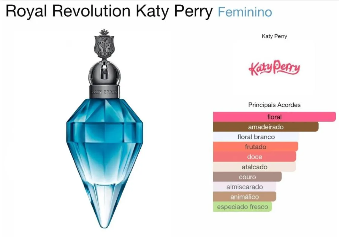 perfume Feminino Floral frutal. Katy Perry Royal Revolution é uma fragrância delicada e jovem, perfeita para acompanhar a mulher moderna em seus compromissos diários.