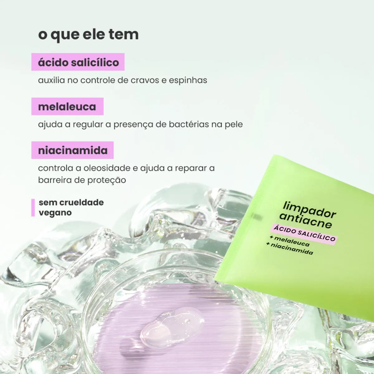 Gel-espuma, livre de sulfatos, feito especialmente para o cuidado diário das peles acneicas. desenvolvido para o uso facial, incluindo área dos Olhos, mas também pode ser usado no Corpo, sua fórmula possui Ácido Salicílico, Melaleuca e Niacinamida, formando uma poderosa ação para tratar e evitar o aparecimento de cravos e espinhas.