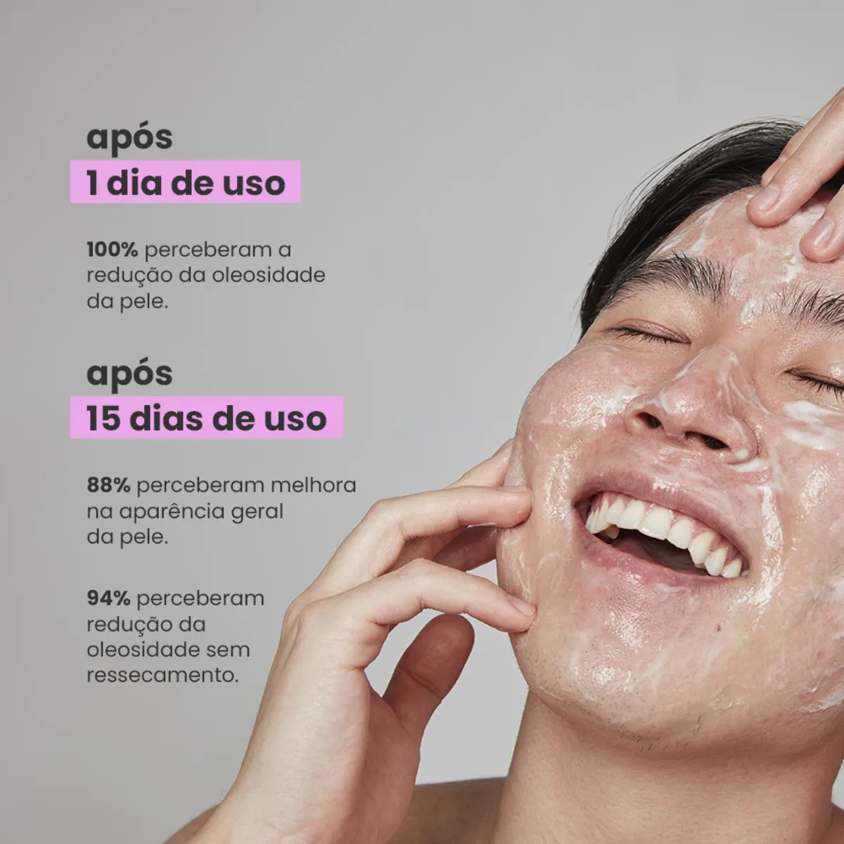 Nos testes clínicos apresentou remoção comprovada de poluição. 9 em cada 10 perceberam a pele limpa sem repuxar e o controle da oleosidade.