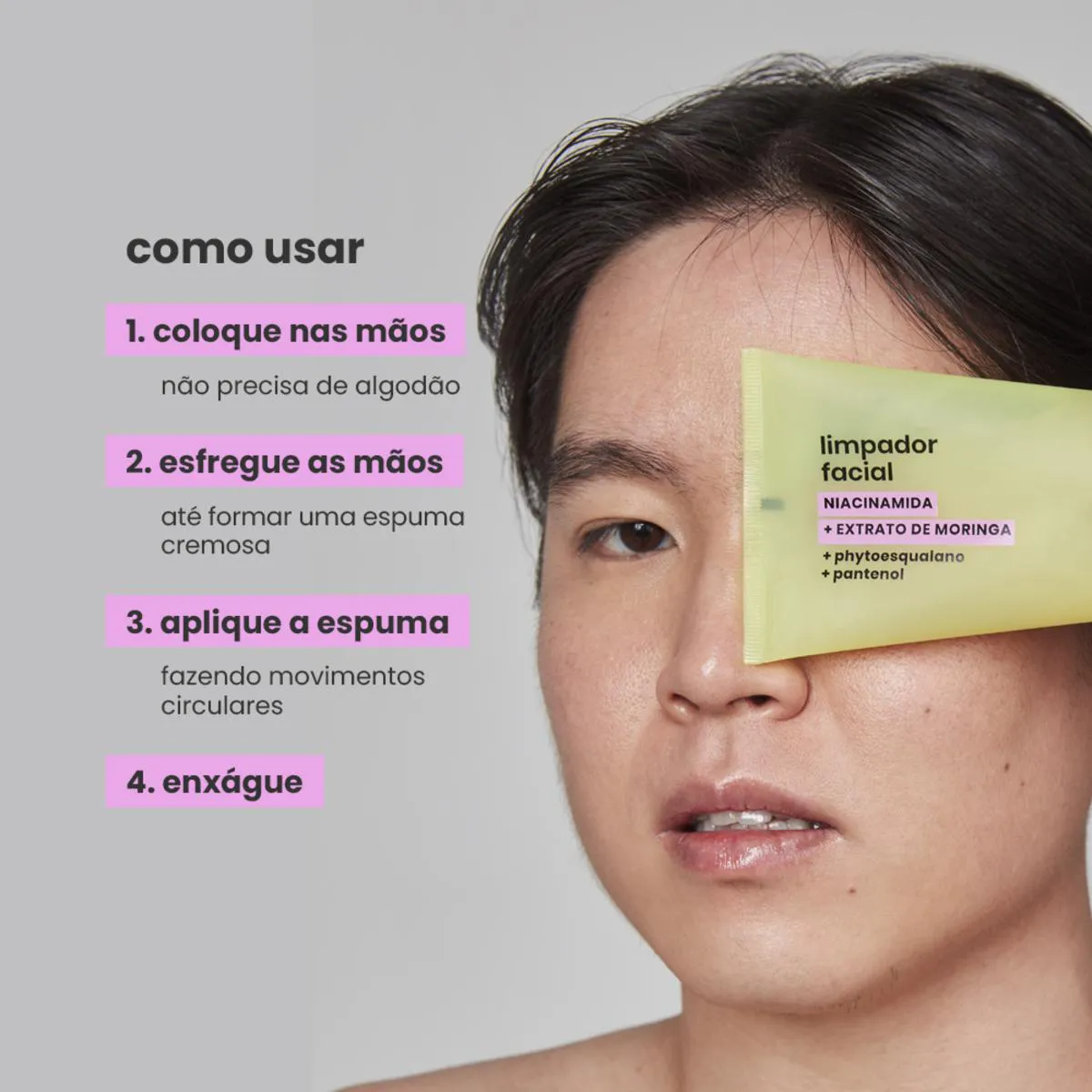 É um gel de limpeza facial em textura gel-espuma, que limpa profundamente sem ressecar a pele. Sua fórmula combina Niacinamida, Extrato de Moringa, Phytoesqualano e Pantenol, que limpam enquanto mantêm a hidratação.