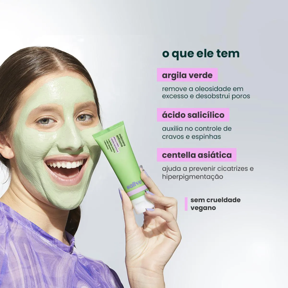 Sua fórmula possui argila verde, que remove a oleosidade em excesso e reduz a aparência dos poros. ácido salicílico, que desobstrui os poros e auxilia na redução de espinhas, centella asiática, alfa-bisabolol e alantoína, que possuem ação anti-inflamatória, acalmando e diminuindo a vermelhidão da pele. Desobstrui poros e auxilia na remoção de cravos, tem efeito cicatrizante em espinhas, reduz a inflamação e a vermelhidão da acne, minimiza poros dilatados, acalma a pele, remove oleosidade e deixa a pele macia. Hipoalergênico, testado dermatologicamente em pele sensível, sem testes e sem ingredientes de origem animal (vegano) e tem embalagem 100% reciclável.