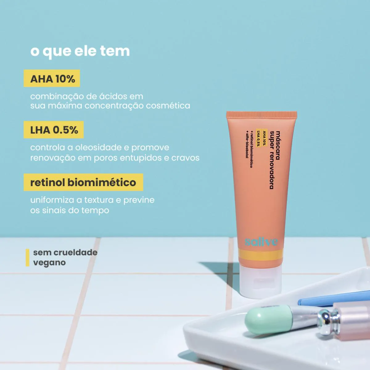 A Máscara Sallve Super Renovadora é um produto de Tratamento para a pele com resultados imediatos. Ela promove uma esfoliação química de alta eficácia e bastante potente. Sua fórmula conta com uma combinação de 6% de ácido lático, 4% de ácido glicólico, LHA, retinol biomimético e alfa bisabolol, responsáveis pela ação esfoliante e antibacteriana, que também melhora a textura e firmeza da pele.