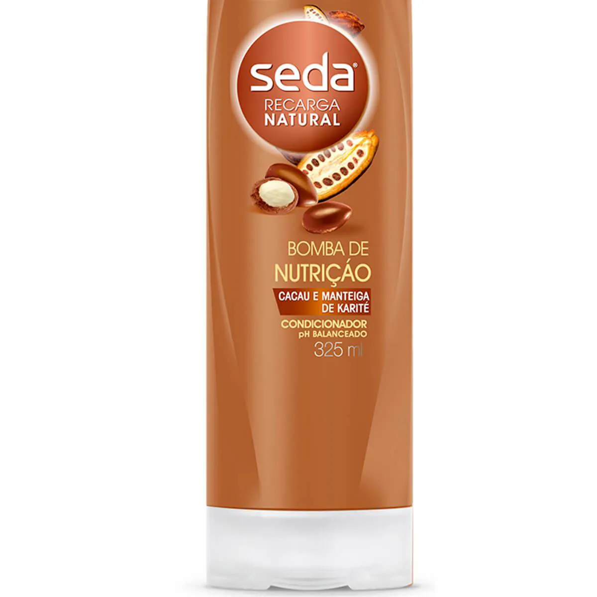Condicionador Bomba de Nutrição Seda contém Cacau e a Manteiga de Karité, com propriedades revitalizantes, proporcionam cabelos visivelmente mais saudáveis, brilhantes e Com Frizz controlados.