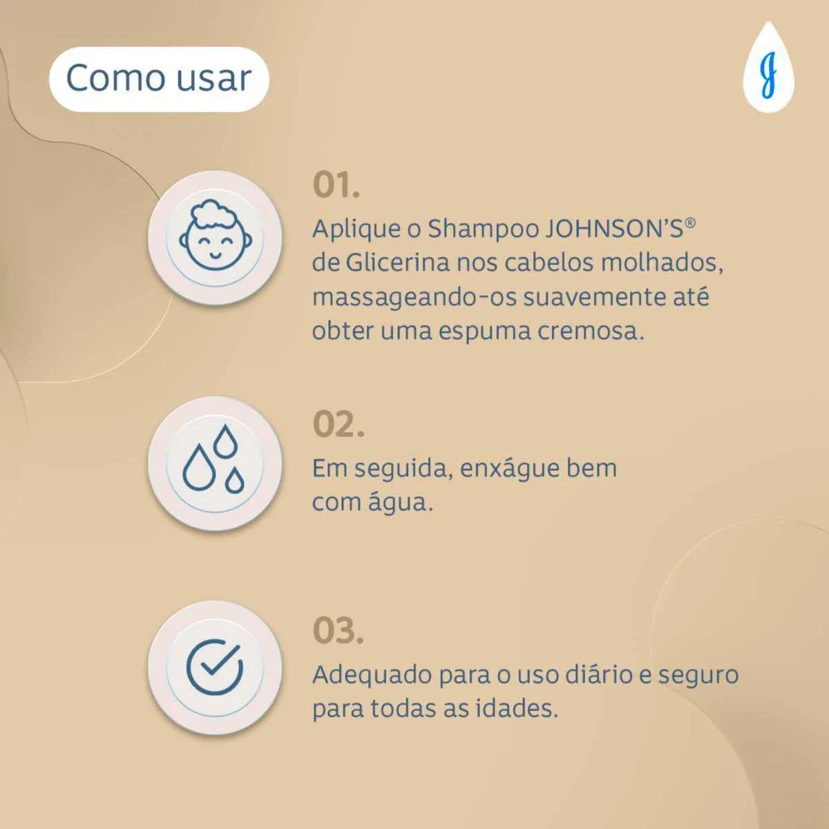 Com os cabelos molhados, aplique o shampoo Johnson's Baby e massageie suavemente até obter uma espuma cremosa. Para finalizar, enxágue para retirar o produto completamente.
