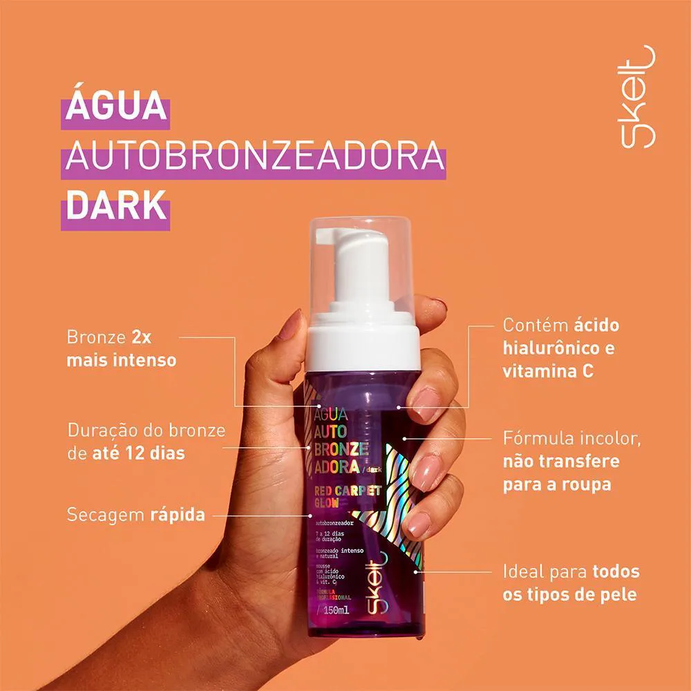 A Água Autobronzeadora Dark da Skelt proporciona um bronzeado duas vezes mais intenso em comparação à versão tradicional. O produto tem textura em mousse, é leve e de fácil aplicação. Dois ingredientes ganham destaque na fórmula: o ácido hialurônico, que potencializa a hidratação da pele; e a vitamina c, poderoso antioxidante capaz de combater os radicais livres. O resultado é um bronze uniforme, natural, de longa duração e, o melhor: totalmente saudável. Por não ter cor-guia, este autobronzeador Skelt é indicado para os mais experientes em autobronzeamento. * RESULTADO: Bronzeador * SUGESTÕES DE USO: Aplicação com luva: