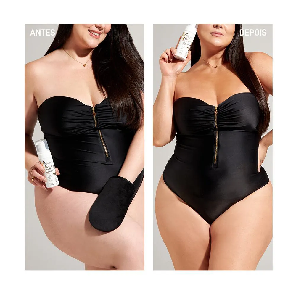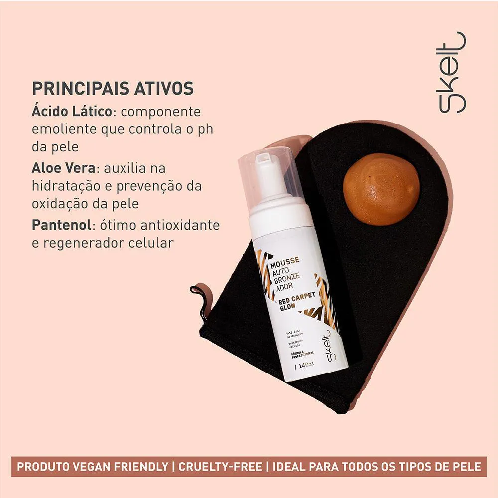 O Mousse Autobronzeador Skelt traz a mais avançada tecnologia em autobronzeamento: quem dita a cor do seu bronzeado é você mesma! Sua fórmula contém ácido lático e aloe vera que auxiliam na hidratação da pele. Para um bronze leve, deixe o produto agir de 3 a 5 horas. Já para um bronzeado forte e reluzente, de 6 a 8 horas serão suficientes. Depois é só retirar o produto do Corpo com água morna. O bronzeado, natural e impecável, dura de 7 a 12 dias. Produto ideal para iniciantes em autobronzeamento, pois possui cor-guia, um tom terroso que sai no banho, pensado para facilitar a aplicação. O produto rende de 8 a 12 aplicações. * RESULTADO:Autobronzeador* SUGESTÕES DE USO:1.Agite bem;2.Aplique o produto proporcionalmente no corpo;3.Com o auxílio da luva aplicadora, espalhe-o em movimentos circulares;4.Usar uma luva específica é muito importante para evitar manchas.5.Espere secar completamente antes de se vestir;6.Mantenha o autobronzeador Skelt no corpo pelo tempo recomendado na embalagem, de acordo com o seu objetivo;7.Retire o produto no banho e espere 24 horas para a cor do bronzeado se desenvolver por completo. * OBSERVAÇÕES:Imagem Meramente Ilustrativa * ITENS INCLUSOS:1 Skelt Red Carpet Glow Mousse Autobronzeador Corporal 140ml