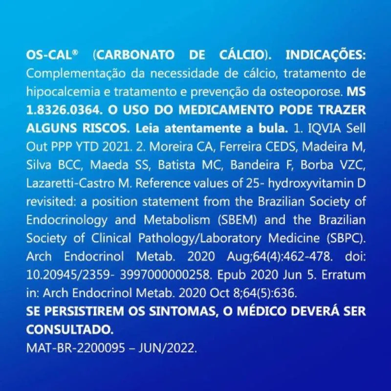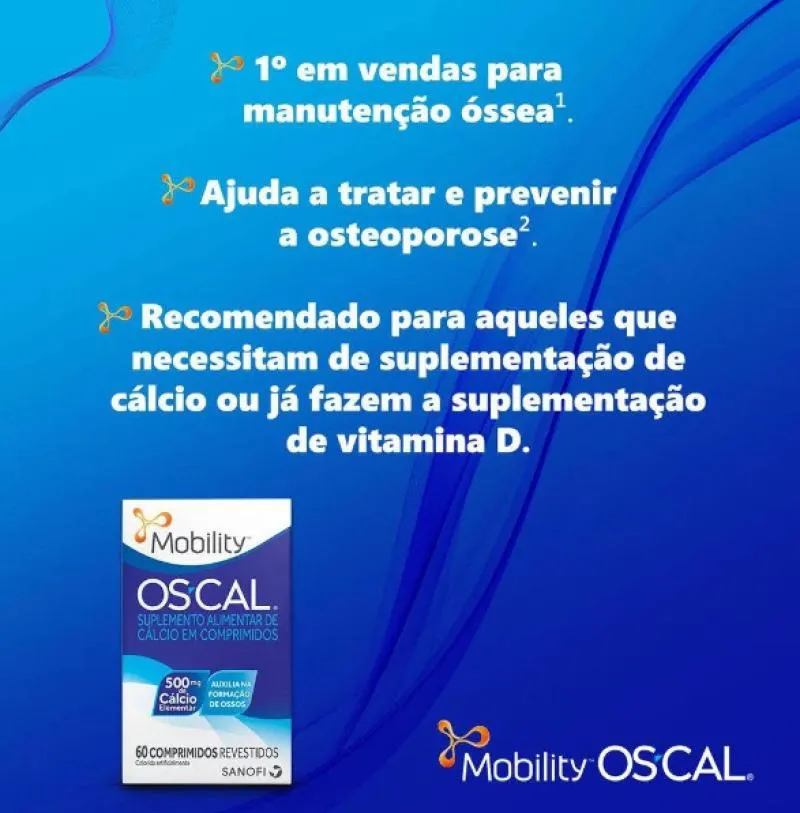Suplemento Vitamínico OS-CAL 500mg Sanofi 60 Comprimidos apresenta propriedades de complemento as necesseidades orgânicas de cálcio em estado deficientes, sendo indicado também para o tratamento e prevenção da Osteoporose.