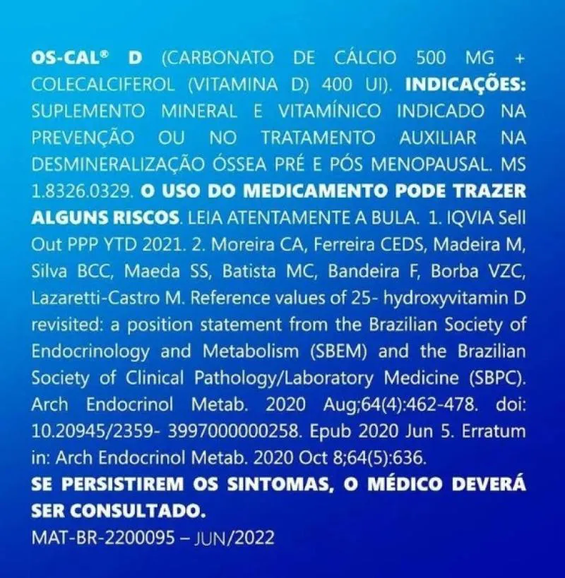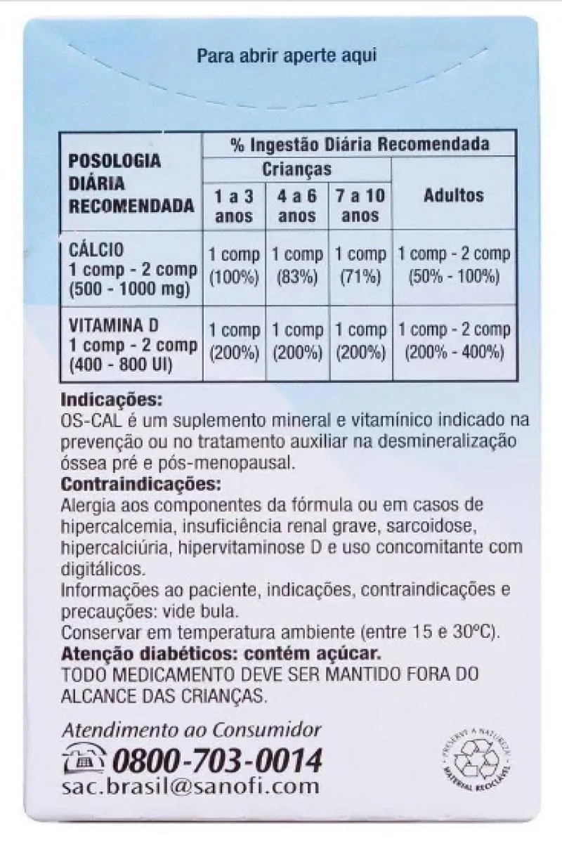 Os-Cal D 400UI possui em sua composição 500mg de cálcio e 400UI de vitamina D2. Está disponível na versão com 60 comprimidos revestidos e deve ser administrado uma vez ao dia, preferencialmente durante a refeição2.