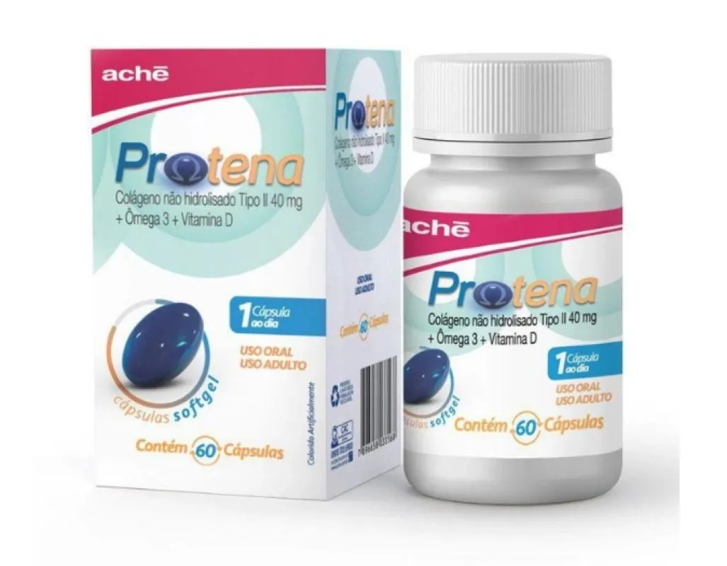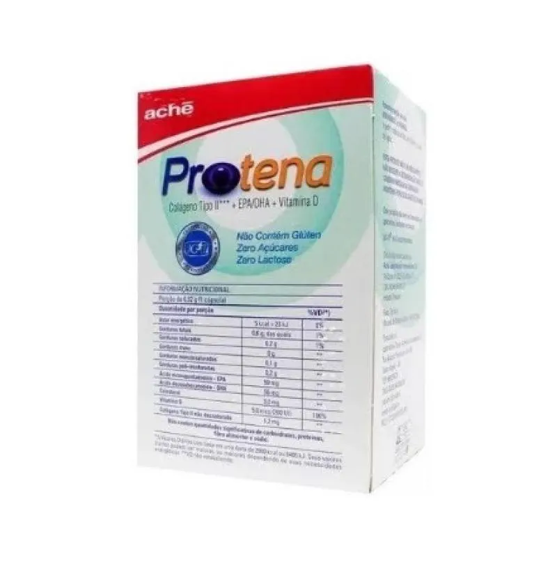 O Protena é um suplemento alimentar em cápsulas, composto por colágeno tipo II (não hidrolisado), cartilagem de frango, Vitamina D e Ômega 3 (óleo de peixe). Sua função é auxiliar na produção de colágeno e a formação de cartilagem no organismo, fortalecer unhas e cabelos e prevenir e tratar a flacidez. Além disso, seus ingredientes exercem ação antioxidante, antienvelhecimento e são essenciais para o metabolismo.