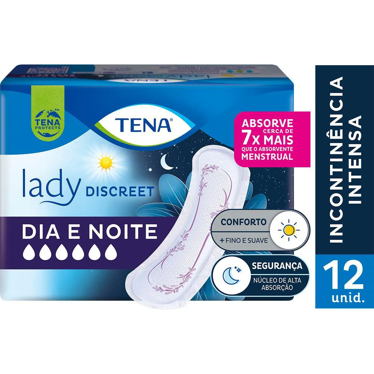 O Tena Lady Discreet Dia e Noite é um Absorvente íntimo feminino que, diferente dos convencionais, pode ser usado não só em casos de incontinência urinária, mas, também, durante o fluxo menstrual, oferecendo proteção e conforto no dia a dia.