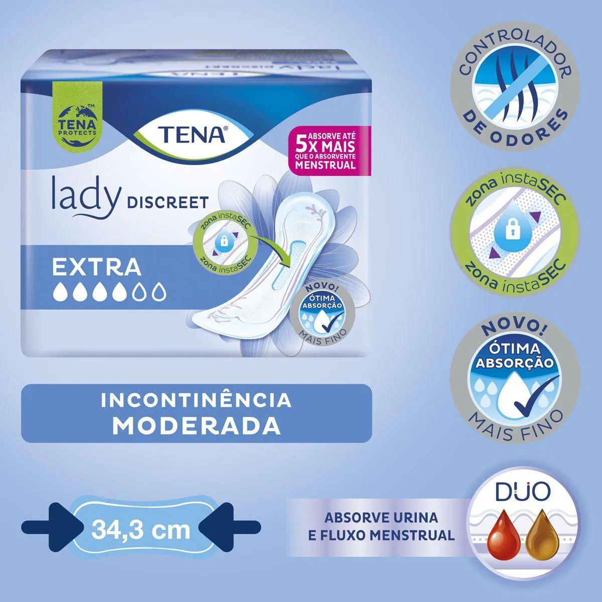 O Tena Lady Discreet Extra é um Absorvente íntimo feminino que, diferente dos convencionais, pode ser usado não só em casos de incontinência urinária, mas, também, durante o fluxo menstrual, oferecendo proteção e conforto no dia a dia.