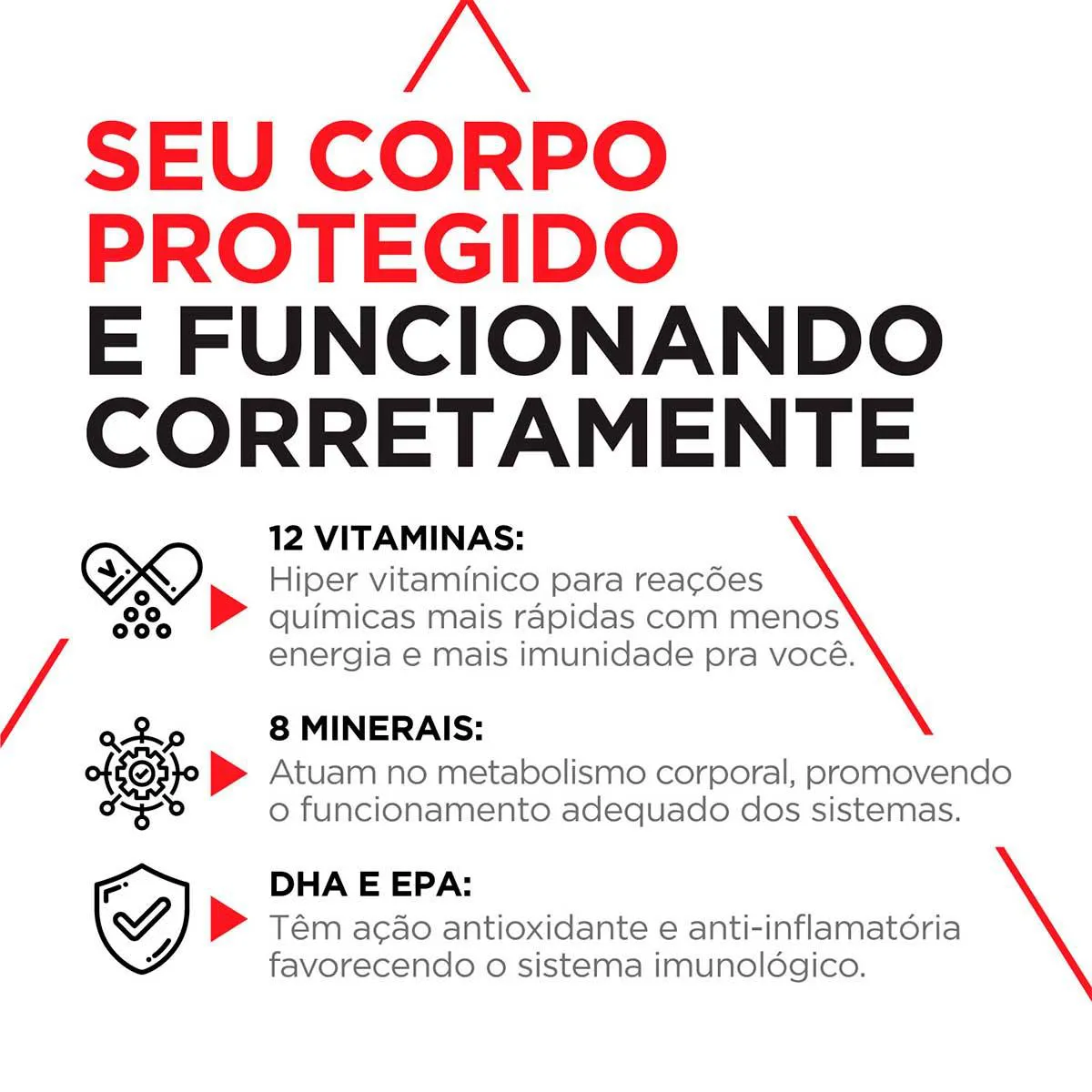 O hiper vitamínico IMUNIDADE TOPWAY possui 12 vitaminas e 8 minerais em alta concentração, além disso, conta também com os benefícios do Ômega 3 (DHA e EPA).