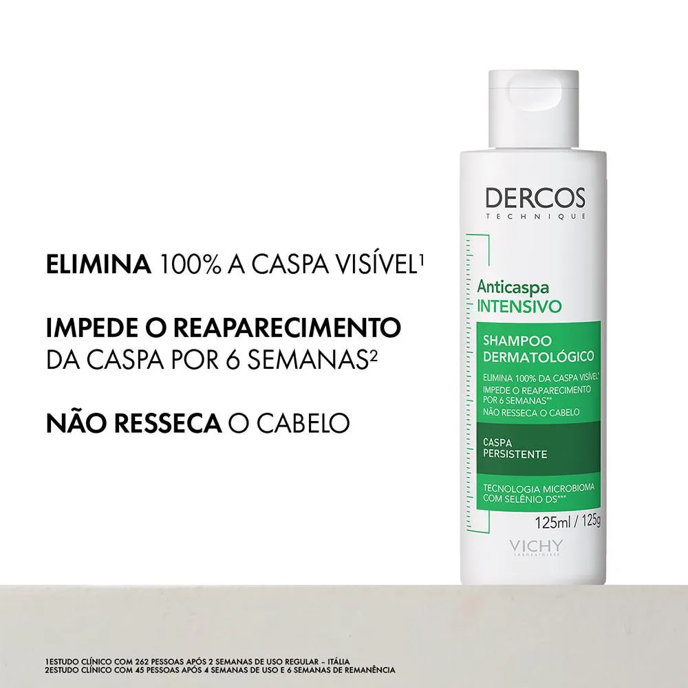 O Shampoo Vichy Dercos Anticaspa Intensivo é um tratamento para combater cabelos com caspa persistente, sem ressecar os fios. Além disso, Dercos Anticaspa conta com uma tecnologia que ajuda a eliminar 100% das caspas visíveis, agindo desde a primeira aplicação e evitando a reincidência por até 6 semanas. * RESULTADO: Anticaspa * SUGESTÕES DE USO: 1.Aplicar o shampoo no couro cabeludo e cabelos úmidos;2.Massagear gentilmente;3.Deixar agir por 2 minutos e enxaguar. * OBSERVAÇÕES: Imagem Meramente Ilustrativa * ITENS INCLUSOS: 1 Vichy Dercos Anticaspa Intensivo Shampoo 125 ml