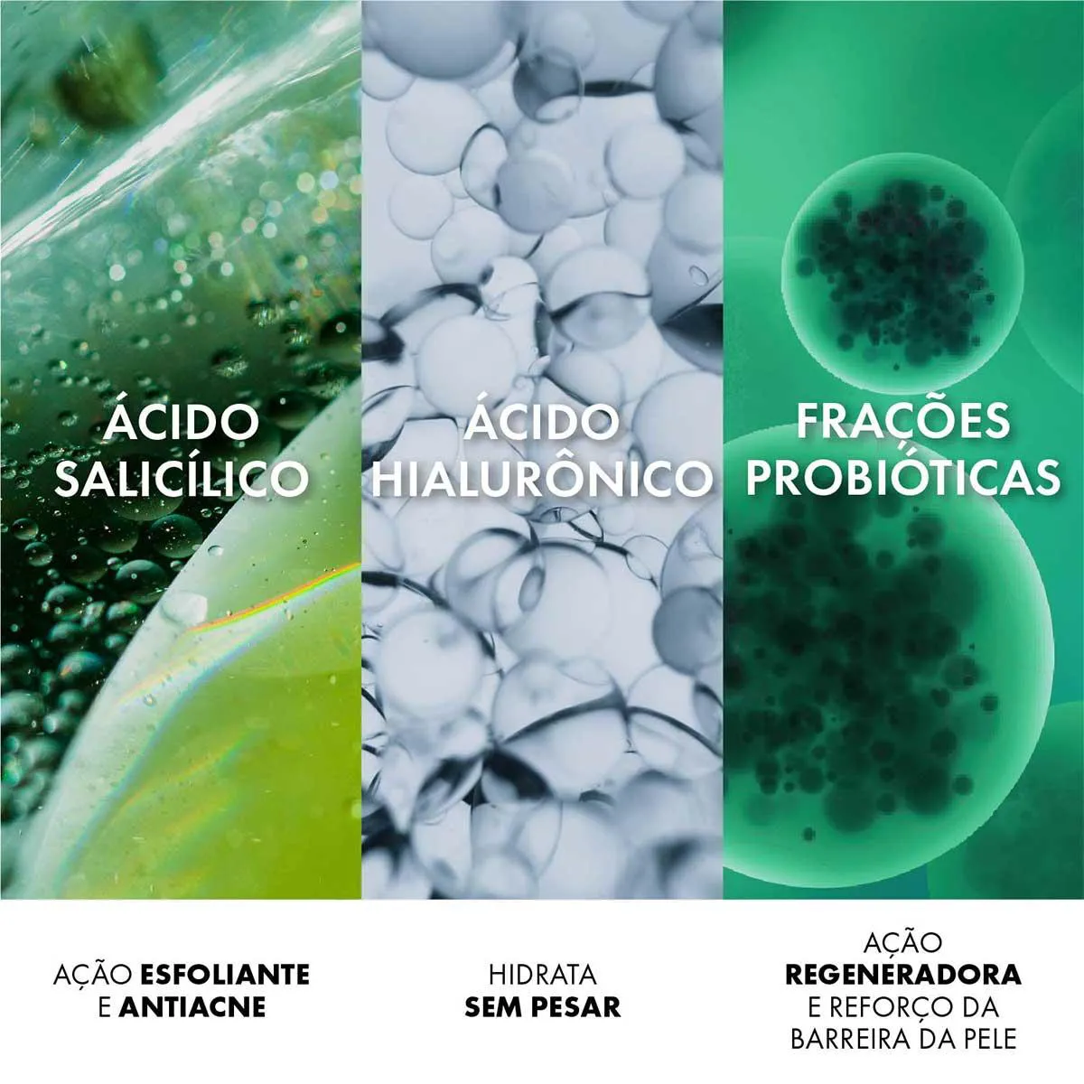 Sua fórmula conta com ácido salicílico e ácido hialurônico, que juntos vão fortalecer a pele contra fatores externos, como estresse e poluição que promovem oleosidade e acnes na pele. Sua textura é leve e suave, de sérum.