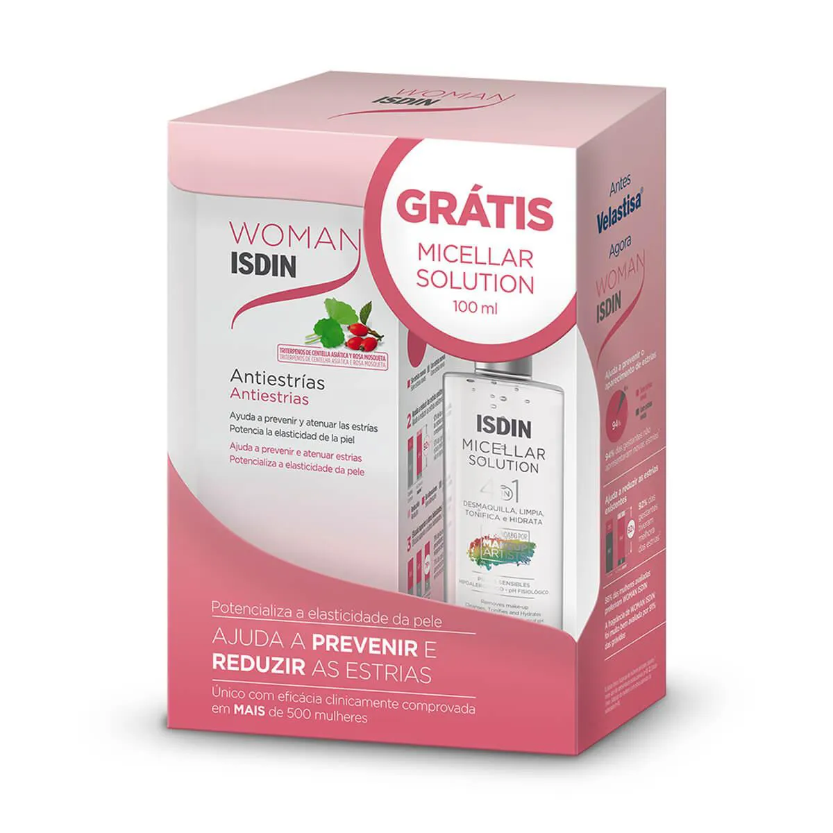 Woman Isdin Antiestrias é um creme de corpo antiestrias de rápida absorção com evidências clínicas que demonstram eficácia no auxílio da prevenção e na redução de estrias. A Isdin Micellar Solution é uma solução de limpeza facial hidratante 4 em 1: demaquila, limpa, tonifica e hidrata,sendo indicada para todos os tipos de pele.