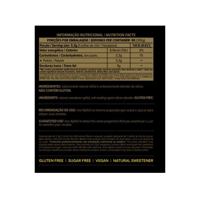 Xylitol Essential Nutrition 300g O Xylitol, da Essential Nutrition, é um adoçante dietético em pó 100% natural, extraído do milho não transgênico (NON-GMO). Possui o poder de adoçamento igual ao do açúcar, com apenas 8 kcal na porção. Não provoca cáries e não causa picos de açúcar no sangue, ou seja, possui baixo índice glicêmico. Sugestão de consumo: Pode ser usado em substituição do açúcar comum. O Xylitol Essential pode ser usado na mesma proporção do açúcar: 1 para 1, não ultrapassando o consumo diário de 60g por dia. Motivos para escolher o produto: